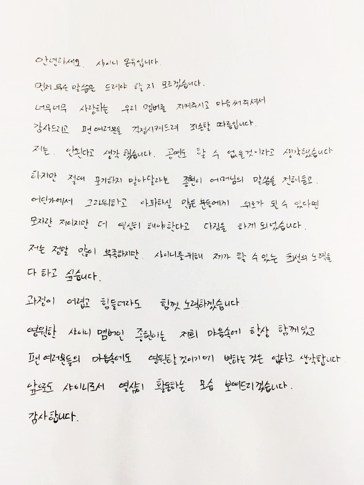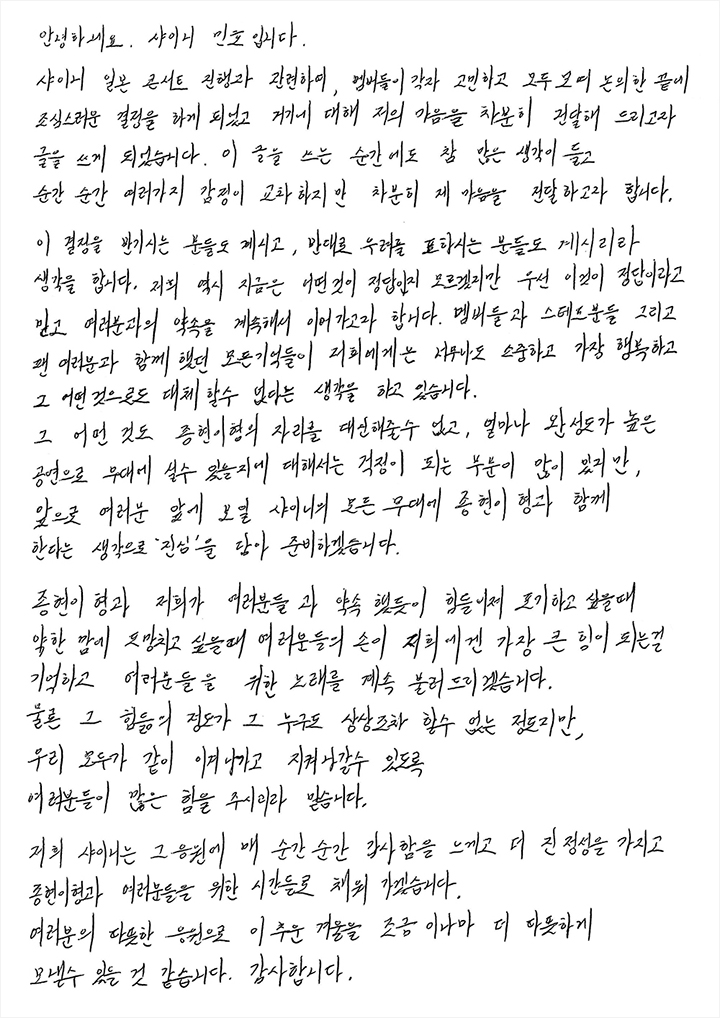 In regards to SHINee's Japanese concert, the members thought about it individually before meeting to discuss our plan and reached a careful decision at the end so I'm writing this to calmly convey my thoughts on the subject. Even as I am writing this now many thoughts are racing through my head and many emotions are intersecting moment by moment but I will try to convey my feelings calmly. I think there will be people who welcome this decision, but also people who express concern. We also don't know what the right answer is but we trust that this is the right answer for now and we plan to keep our promise with everyone. The irreplaceable memories we have together with the members, staff, and fans are so precious and make us the happiest. Nothing can take Jonghyun hyung's place, and there are a lot of worries about how complete our performances on stage will be, but we will prepare every future SHINee performance with 'sincerity' as if we are with Jonghyun hyung. As we promised to Jonghyun hyung and everyone, when we feel like giving up cos things get hard and want to run away from our weak hearts, we remember that everyone's help is the greatest strength to us and will continue singing songs dedicated to you guys. Although no one can even imagine the extent of our hardships, we will all overcome this together in order to keep our promise and trust that everyone will give us a lot of strength. SHINee feels grateful for that support every moment and will take more sincerity to fill up memories for Jonghyun hyung and everyone. Because of everyone's warm support I think I can spend this cold winter a little more warmly. Thank you.