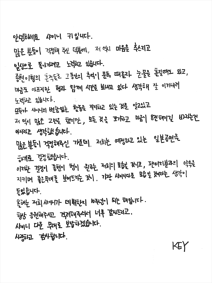 Thanks to many people's concern, I am trying to organize my feelings and return to my normal life. There are times when Jonghyun hyung's traces suddenly remind me of our memories together, and my heart hurts but I'm trying to overcome this by thinking that I'm spending this time with hyung. I am well aware that everyone is supportive of SHINee's unwavering activities and I've thought about this a lot, but I know that giving up everything and hoping to feel better is not the answer. At the core of everyone's worries, we have decided to go on with the Japanese concert as planned. We thought that this decision would be what Jonghyun hyung would have wanted to see, and keeping our promise to our fans by showing them a good performance, is the most SHINee-like image. This year will be SHINee's tenth year since debuting. Thank you so much for always cheering on and encouraging us, we will pay you back with a SHINee-like performance. I love you and thank you. KEY