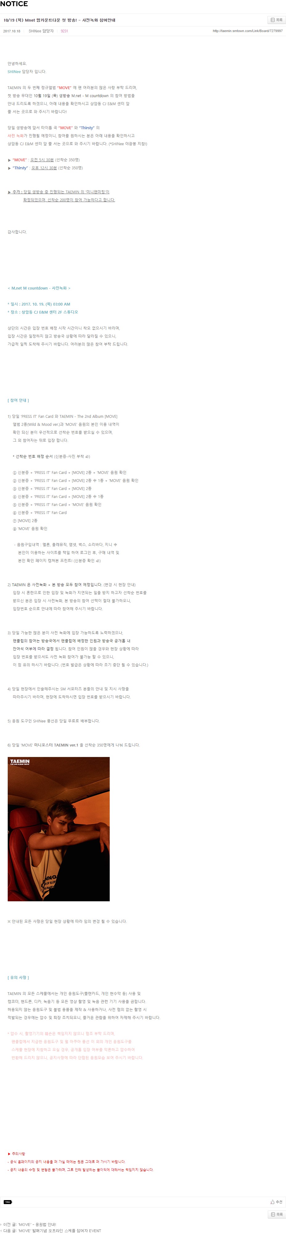 6) 당일 ‘MOVE’ 미니포스터 TAEMIN ver.2 을 선착순 350명에게 나눠 드립니다.