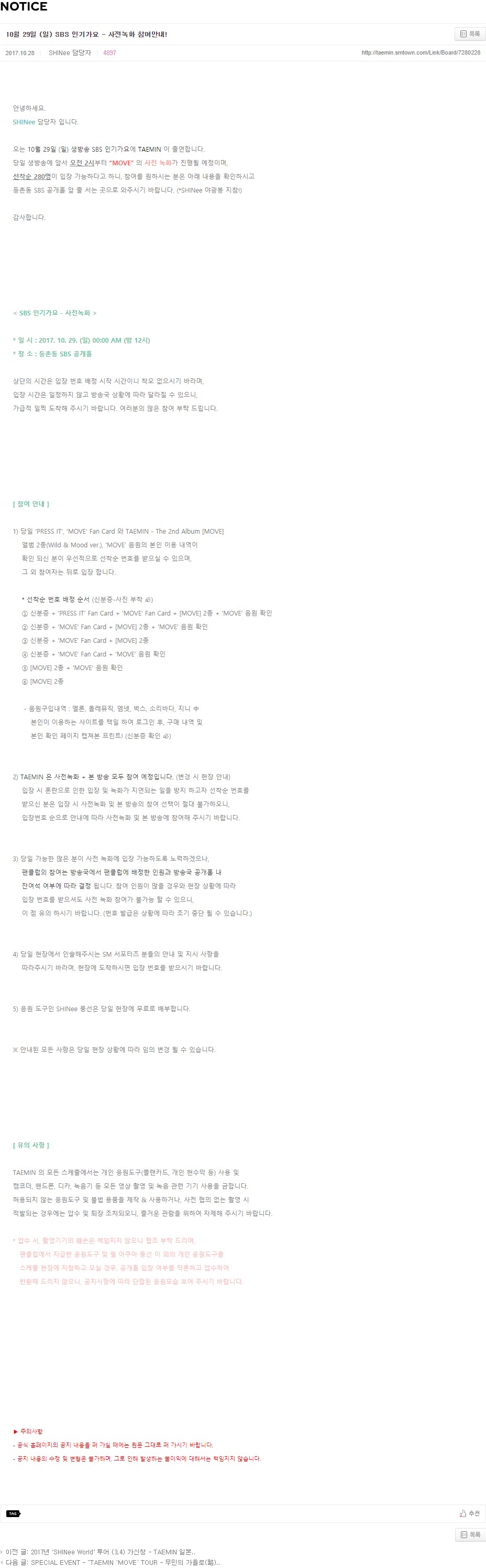 등촌동 SBS 공개홀 앞 줄 서는 곳으로 와주시기 바랍니다. (*SHINee 야광봉 지참!)